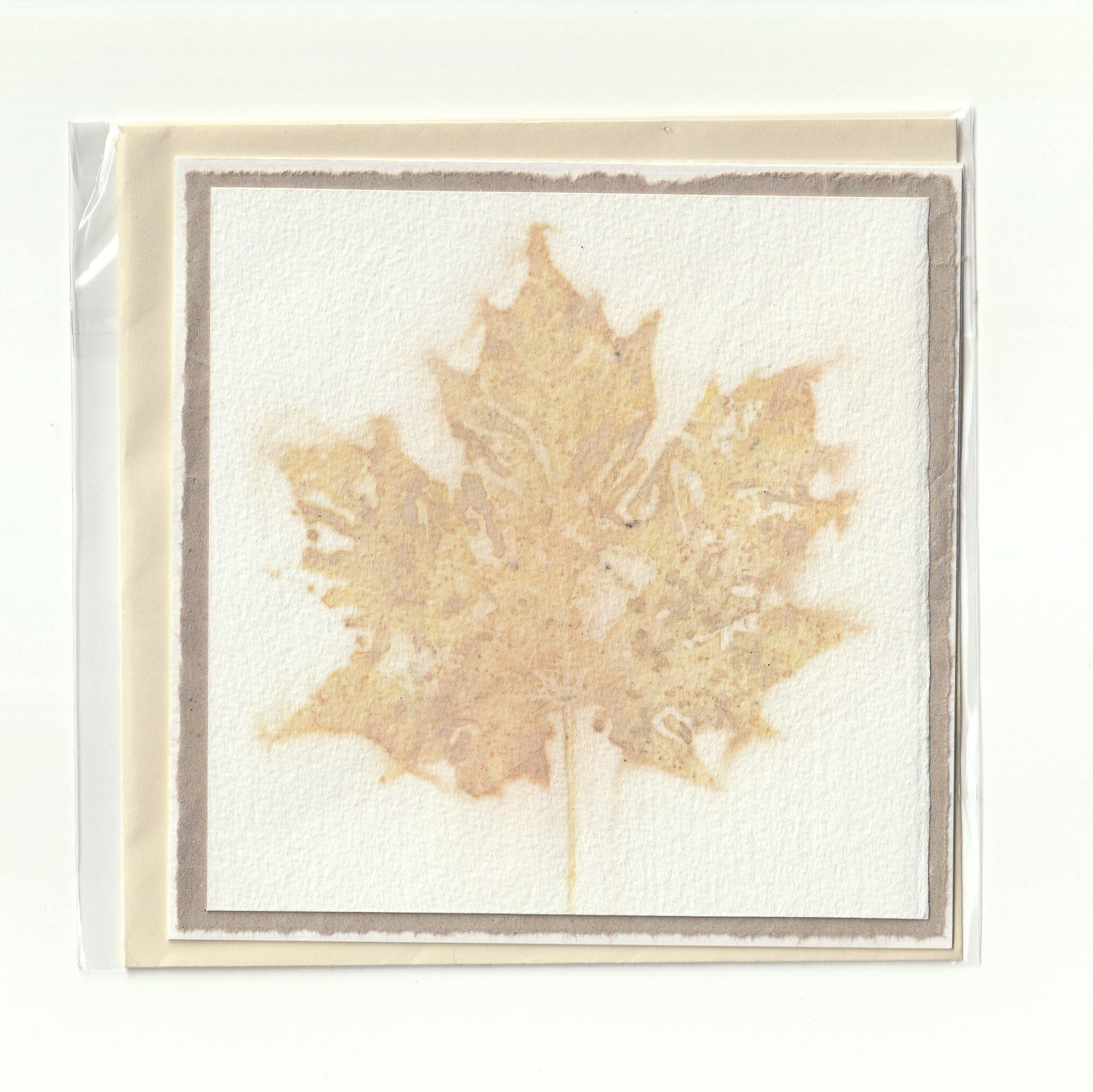 Deze kaart is handgemaakt. De basis is een gevouwen crèmekleurige kaart. Daarop is een ecoprint aangebracht met daaronder kraft papier. Een ecoprint wordt gemaakt met echte bladeren waarvan de pigmenten in het papier zijn getrokken. Daarvoor wordt het papier nat gemaakt. Het kan dus zijn dat er naast de afdruk nog andere vlekken zijn ontstaan.