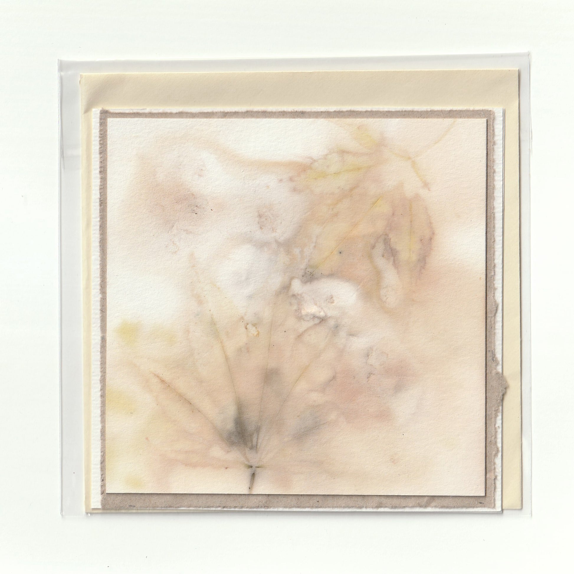 Deze kaart is handgemaakt. De basis is een gevouwen crèmekleurige kaart. Daarop is een ecoprint aangebracht met daaronder kraft papier. Een ecoprint wordt gemaakt met echte bladeren waarvan de pigmenten in het papier zijn getrokken. Daarvoor wordt het papier nat gemaakt. Het kan dus zijn dat er naast de afdruk nog andere vlekken zijn ontstaan.