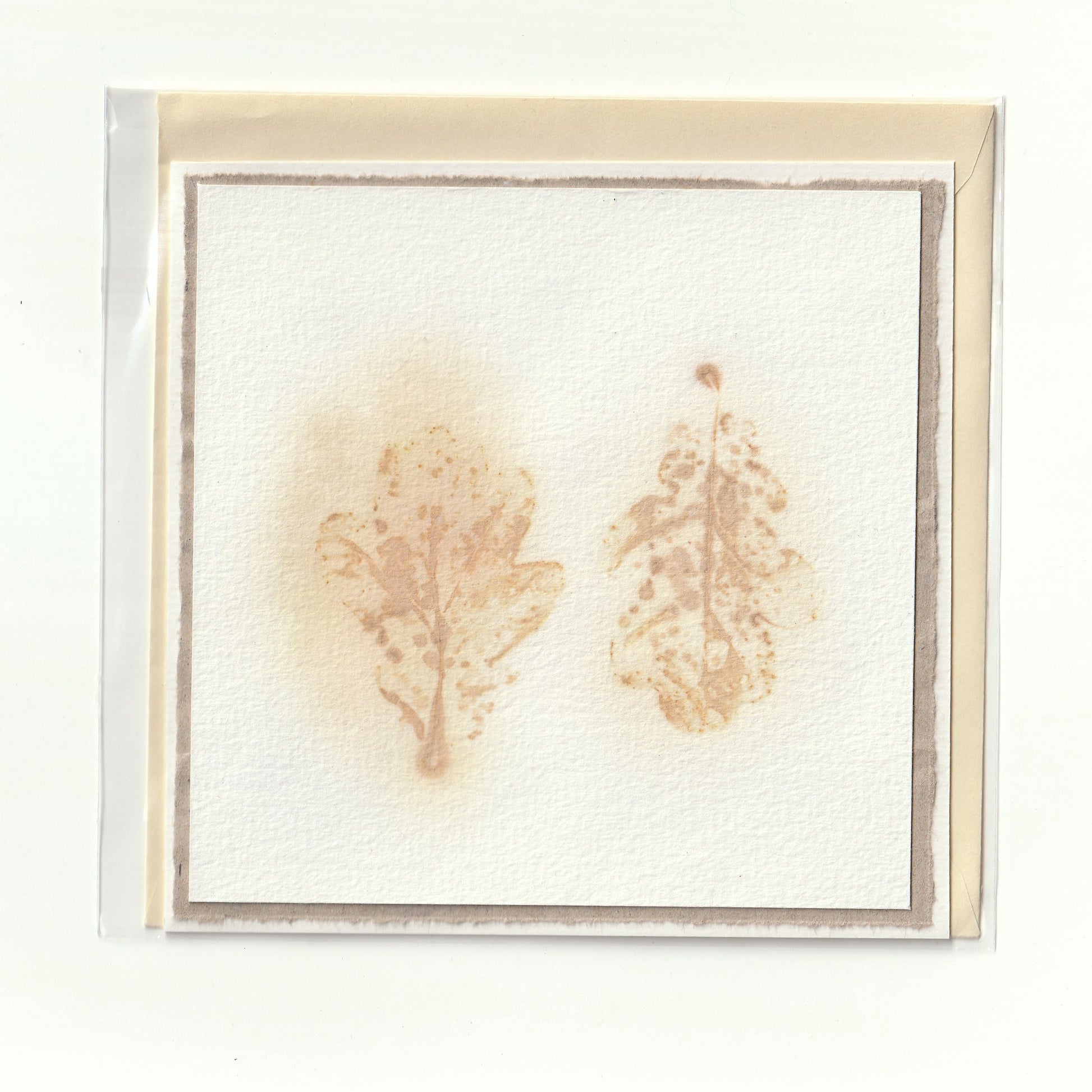 Deze kaart is handgemaakt. De basis is een gevouwen crèmekleurige kaart. Daarop is een ecoprint aangebracht met daaronder kraft papier. Een ecoprint wordt gemaakt met echte bladeren waarvan de pigmenten in het papier zijn getrokken. Daarvoor wordt het papier nat gemaakt. Het kan dus zijn dat er naast de afdruk nog andere vlekken zijn ontstaan.