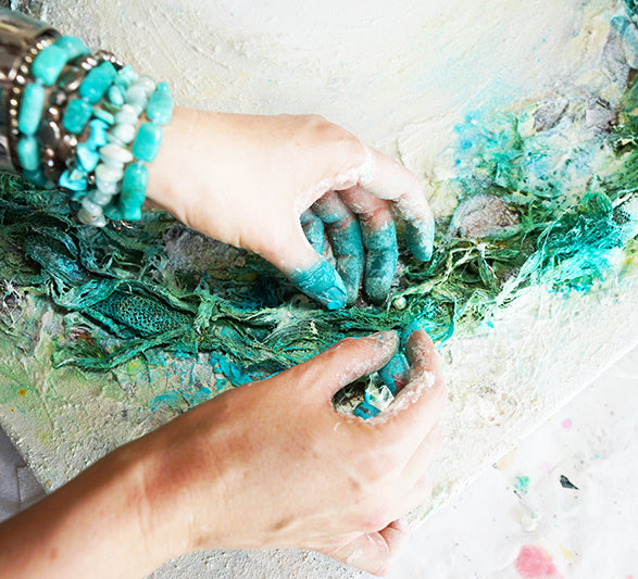 Adoro lavorare con le mie mani. Adoro la consistenza e posso percepirla al meglio avendo le mani direttamente a contatto con il mio lavoro. Lavoro molto anche con materiali antichi e materiali della natura. Non c'è niente di meglio che tornare a casa dopo una lunga passeggiata e incorporare immediatamente ciò che hai portato con te in un dipinto. Quando inizio un dipinto non ho idea di quale sarà il risultato finale. Il dipinto viene creato, per così dire, durante il processo di verniciatura. A volte inizialmente ho in mente un colore o una forma o lavoro basato su un tema, ma lo lascio andare quando inizio a dipingere. Ciò dà al dipinto la libertà di emergere. Ogni volta mi sorprendo del risultato finale...